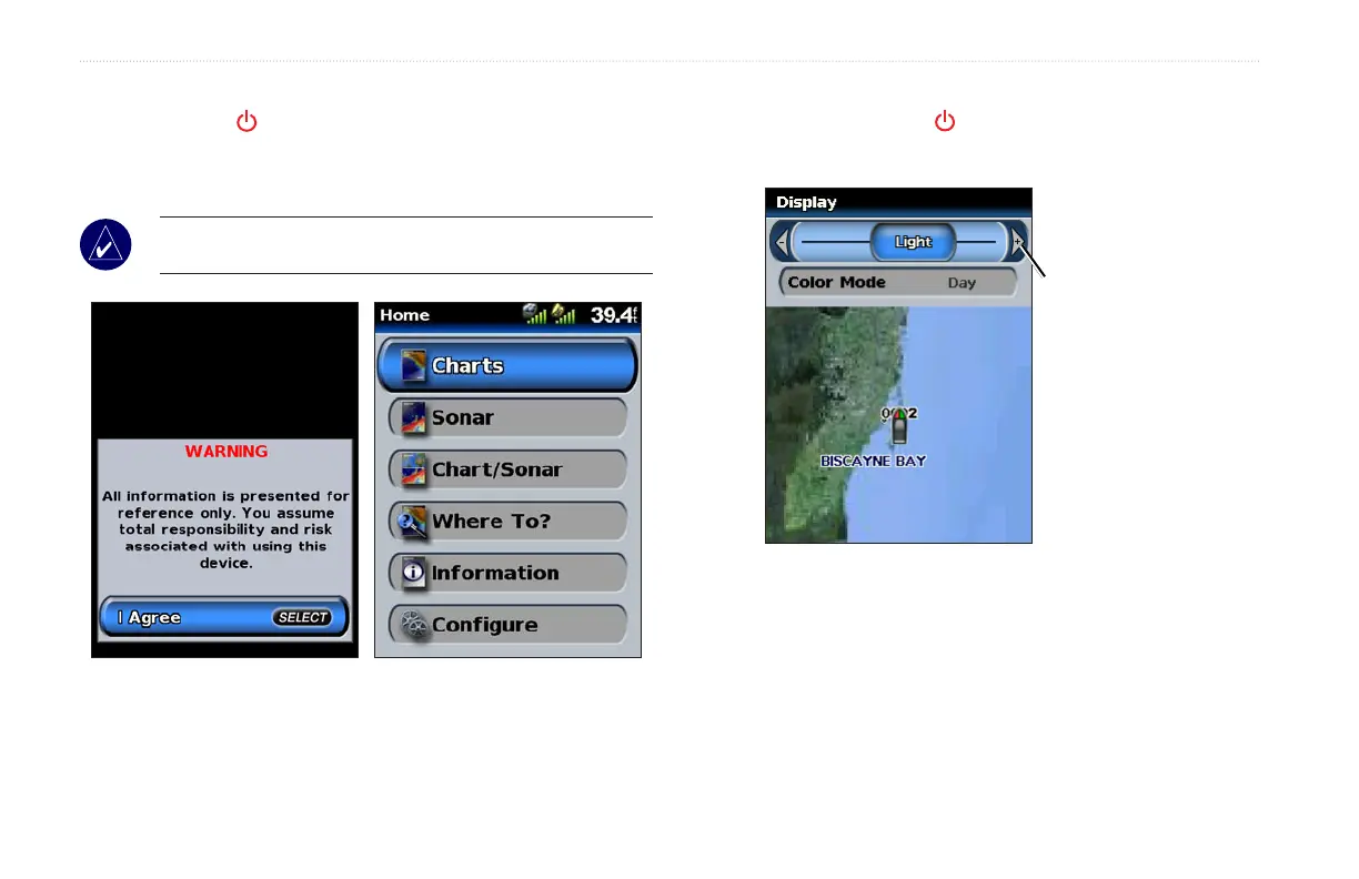 Garmin screen appears. When the Warning screen appears, press