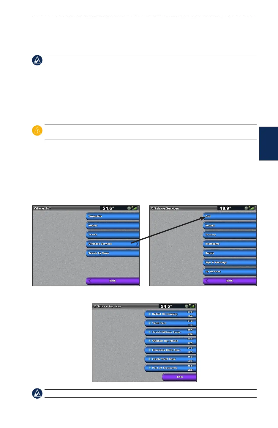 You can search for, and navigate to, waypoints, routes, and services such as nearby fuel, repairs, and