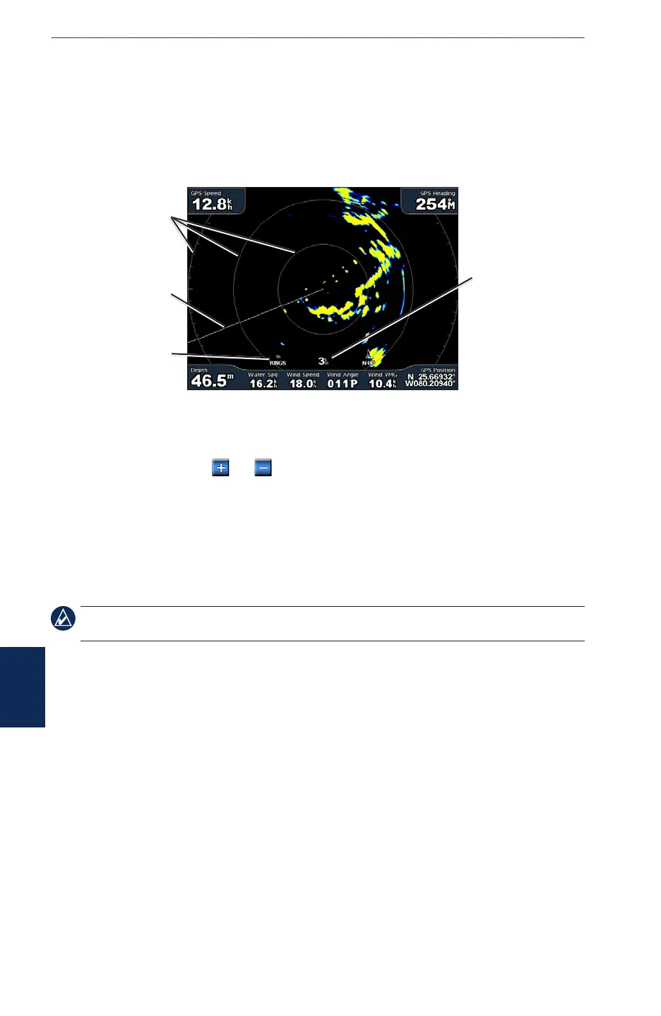 Use the Cruising screen to view a full-screen image of the gathered radar information. Your position