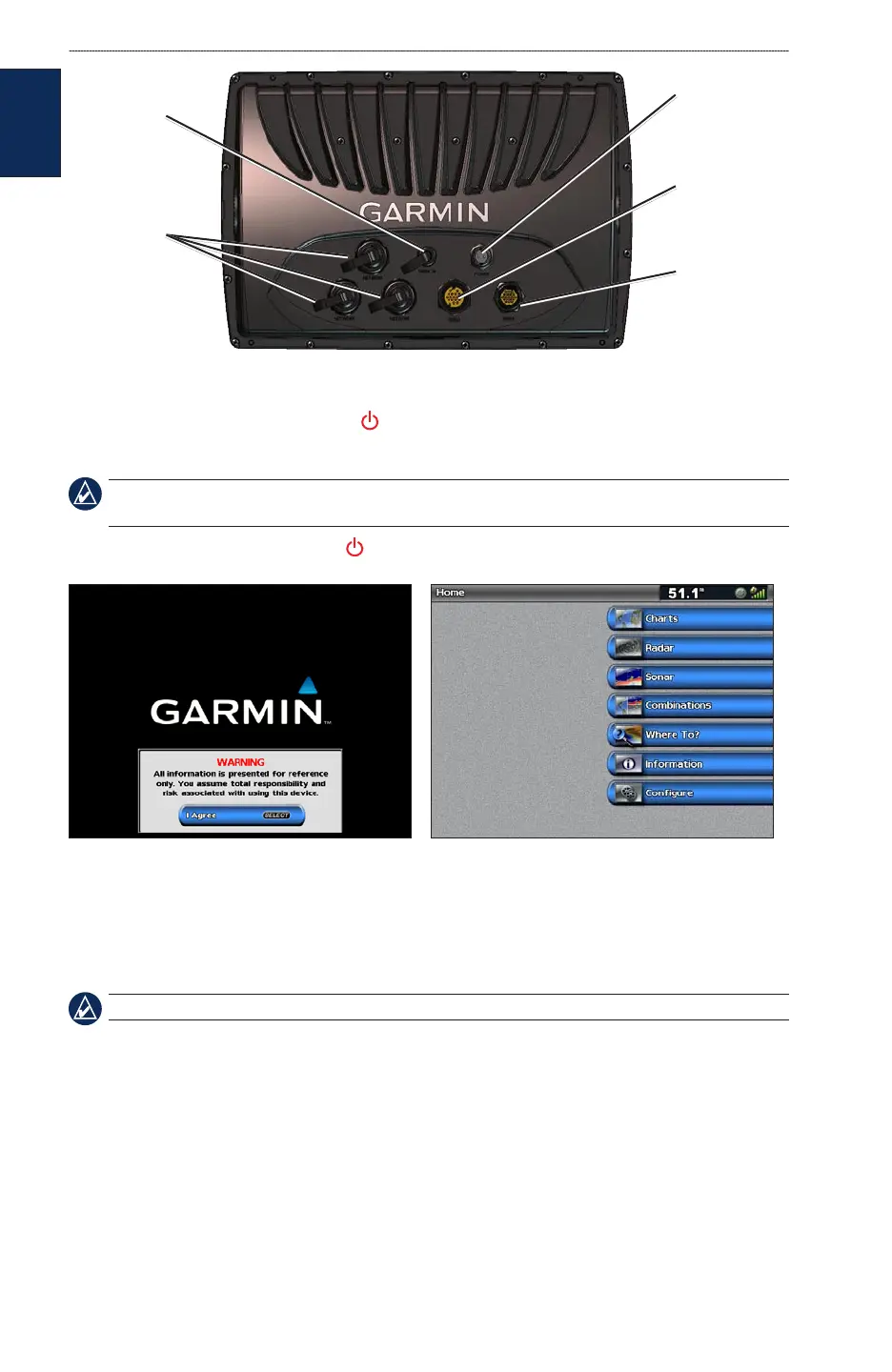 To turn the unit on, press and release the Power key. When the Warning screen appears, select