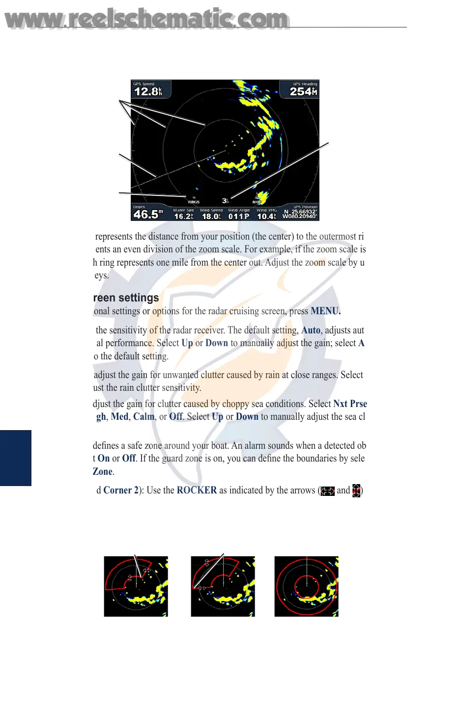 between Rough, Med, Calm, or Off. Select Up or Down to manually adjust the sea clutter
