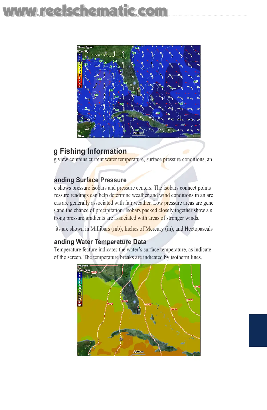 The Water Temperature feature indicates the water’s surface temperature, as indicated by the legend