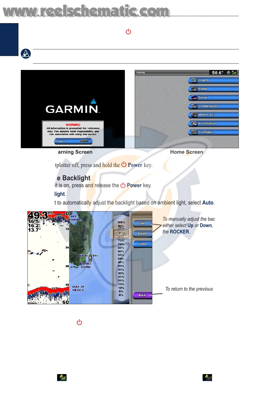 To turn the chartplotter on, press and release the Power key. When the Warning screen appears,