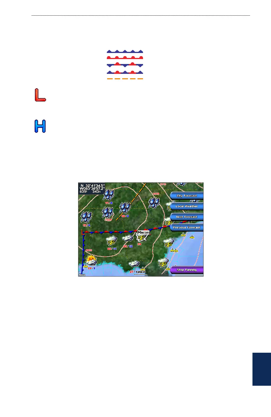 The Fronts show lines indicating the leading edge of an air mass. This feature also shows pressure