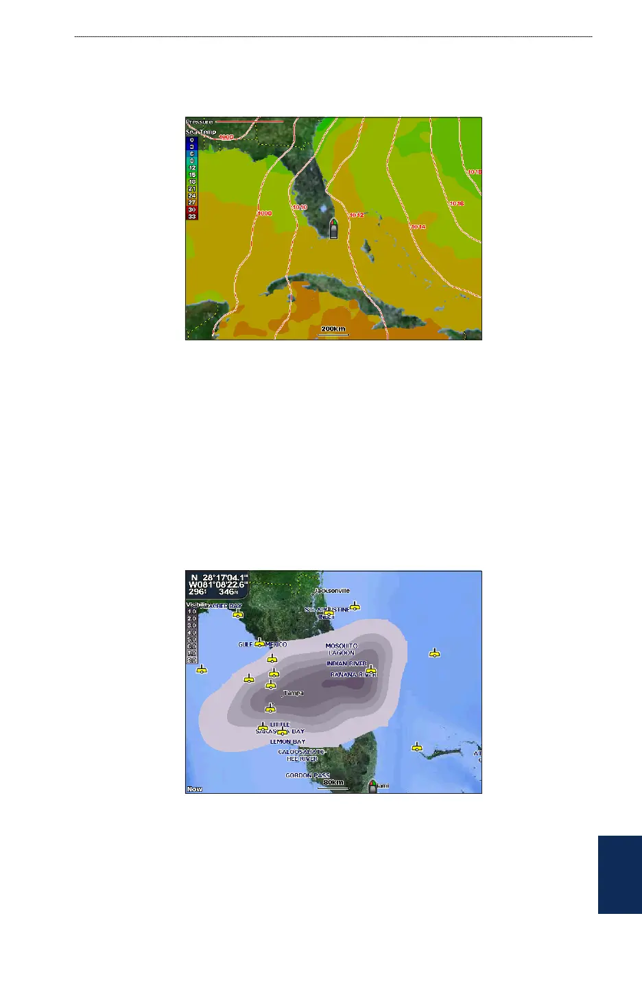The Water Temperature feature indicates the water’s surface temperature, as indicated by the legend