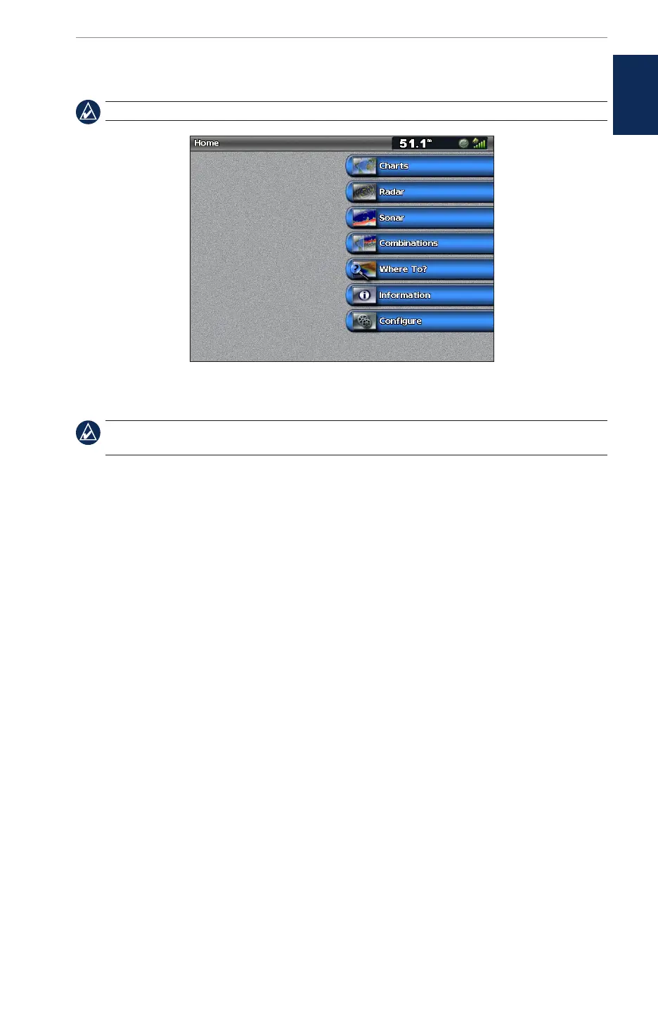 Combinations—sets up the screen to view a chart, sonar, radar, and video in a 2 or 3-eld split