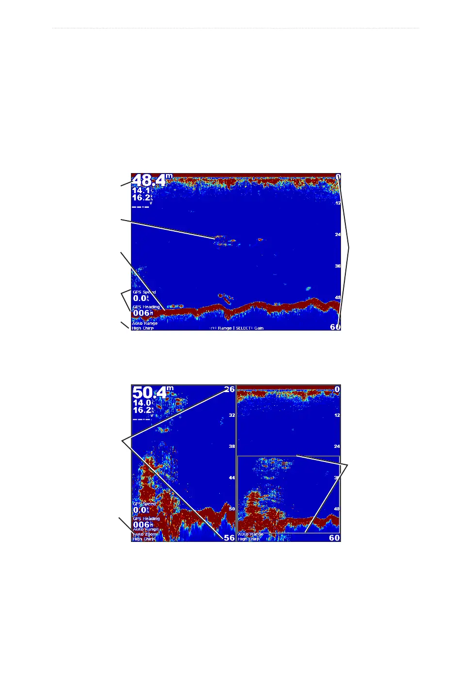 The split-zoom sonar view shows a full-view graph of sonar readings and a magnied portion of that graph on