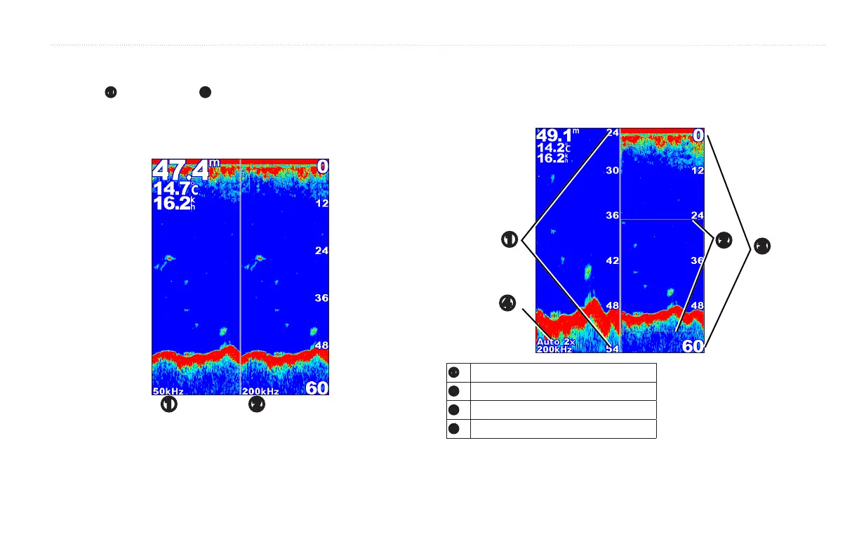 Use the Split Frequency screen (dual-frequency transducer only) to view both