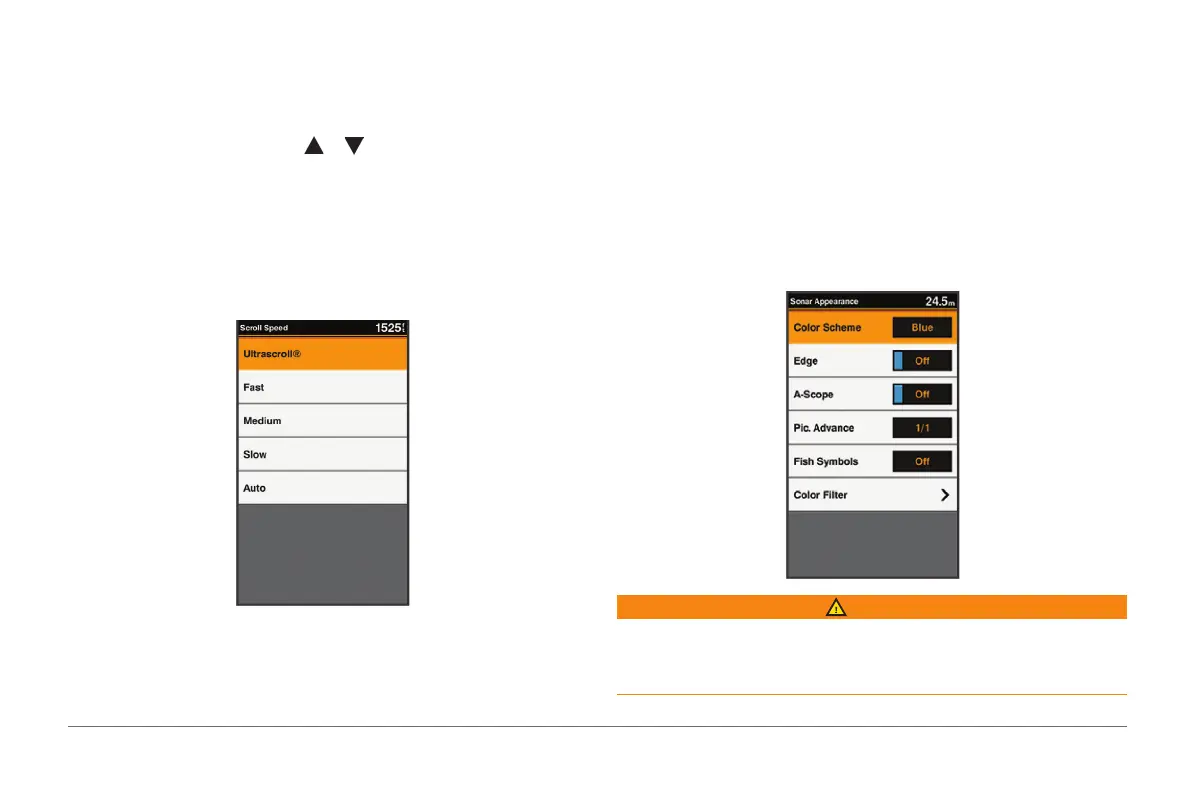 1 From a sonar view, select MENU > Sonar Setup > Scroll Speed.