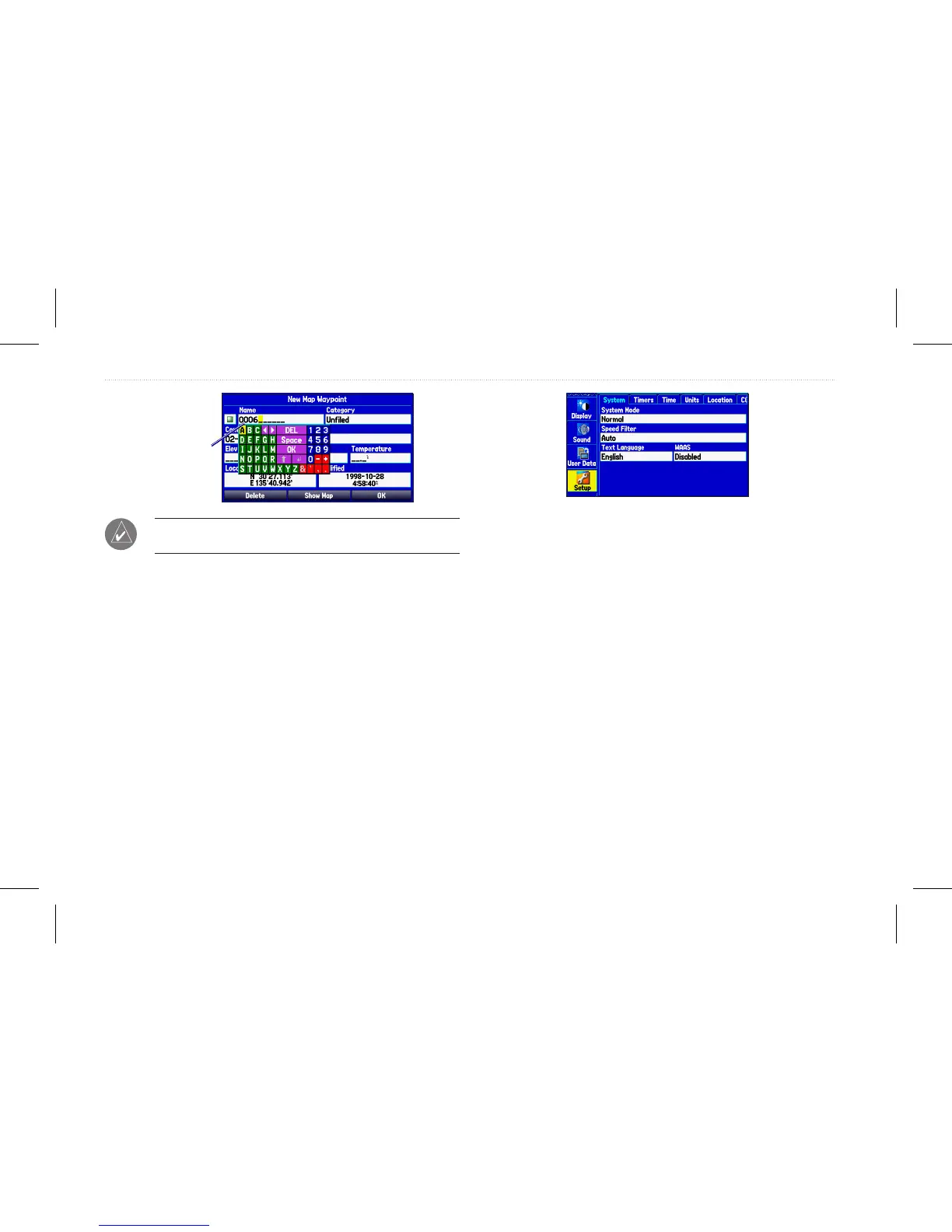 functional tabs --- Waypoint, Route, Tracks, Sonar, Setup, etc. Press