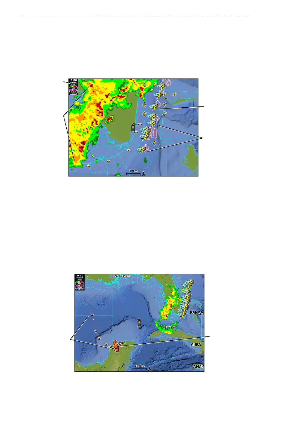 Storm cell icons on the precipitation screen indicate both the present position of a storm and the