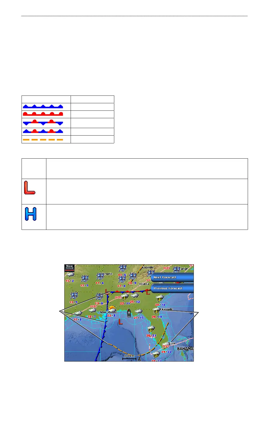 Weather fronts appear as lines that indicate the leading edge of an air mass.