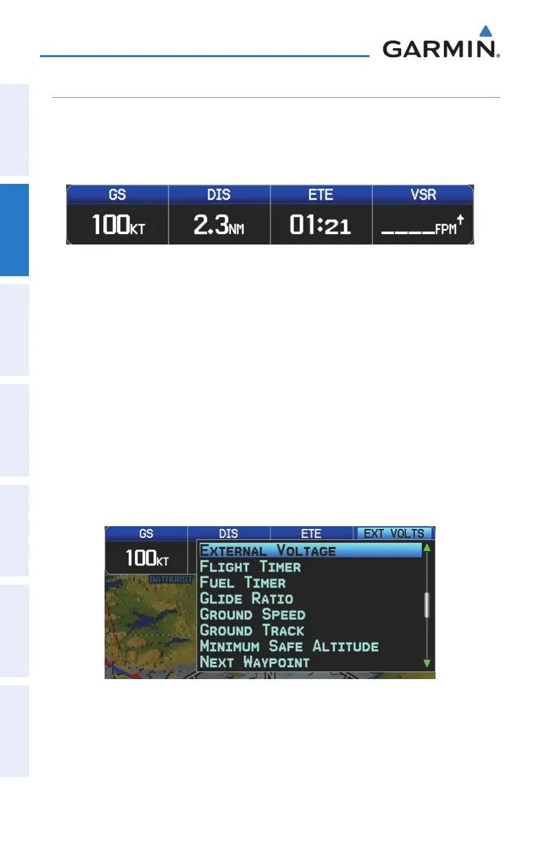 By default, the Data Bar Fields are set to display ground speed (GS), distance (DIS),