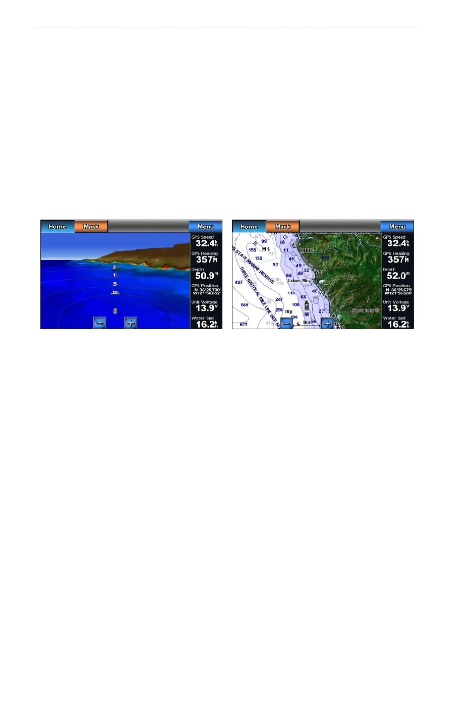 visual navigation aid. This view is helpful when navigating tricky shoals, reefs, bridges, or channels,