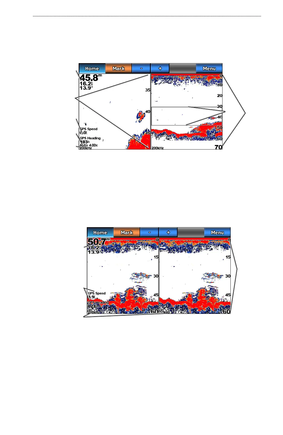 The split-zoom sonar view shows a full-view graph of sonar readings, and a magnied portion of