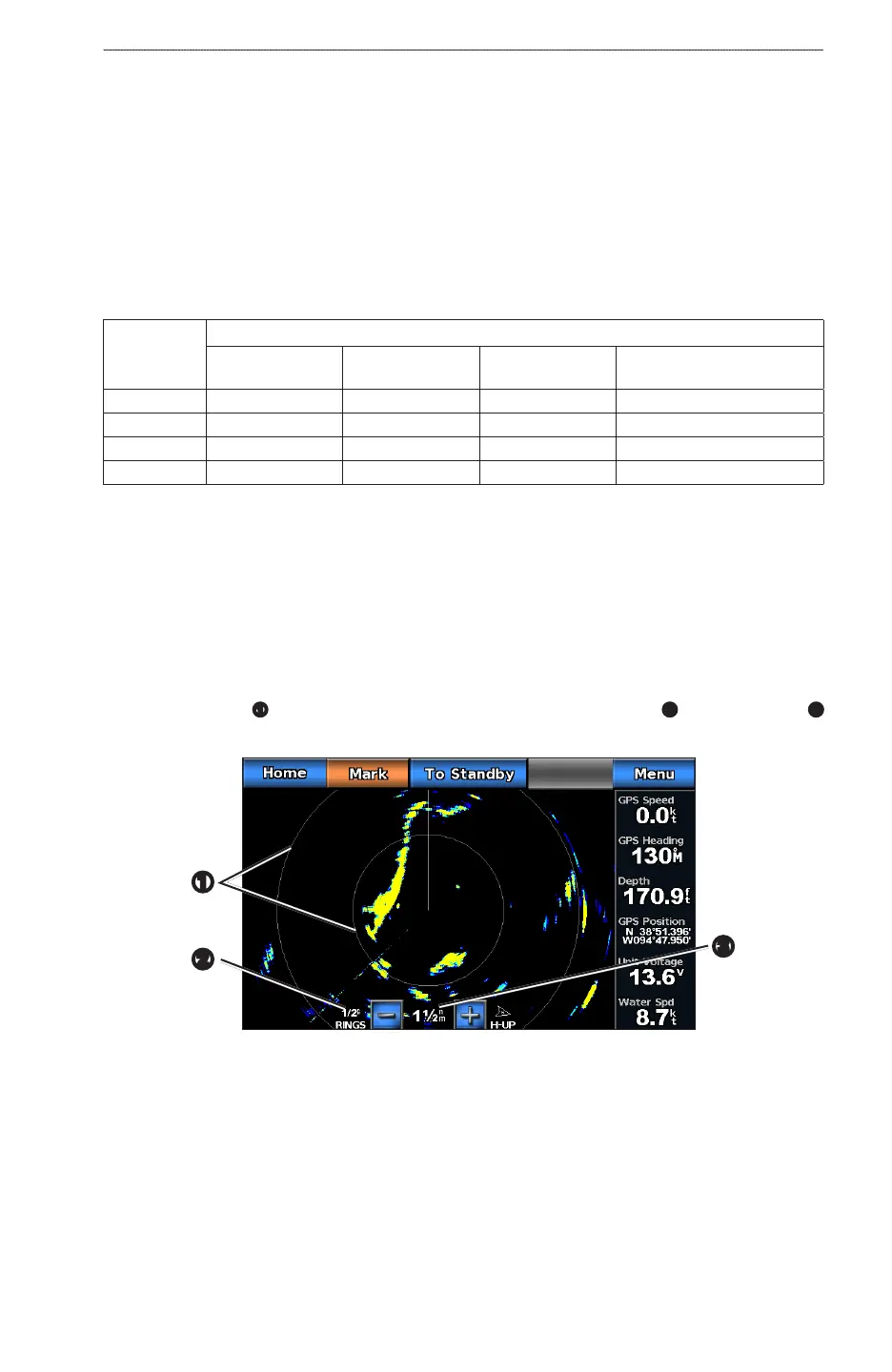 A full-screen image of the gathered radar information appears. Your position is in the center of the screen,