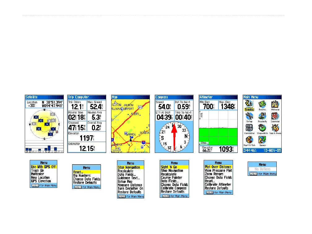 The GPSMAP 76CSx has six main pages: Satellite Page, Trip Computer Page, Map Page, Compass Page,