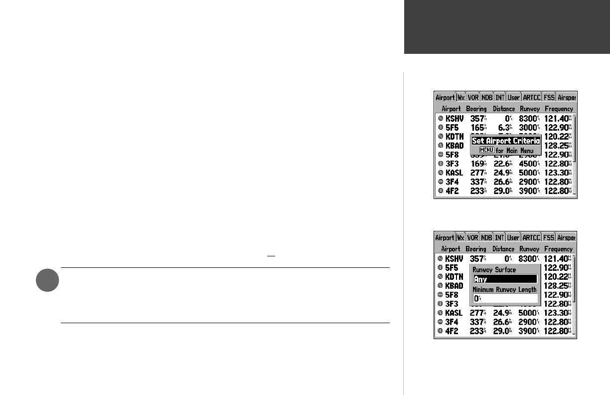 4. Highlight the minimum runway length fi eld and press ENTER. Use the ARROW KEYPAD to select