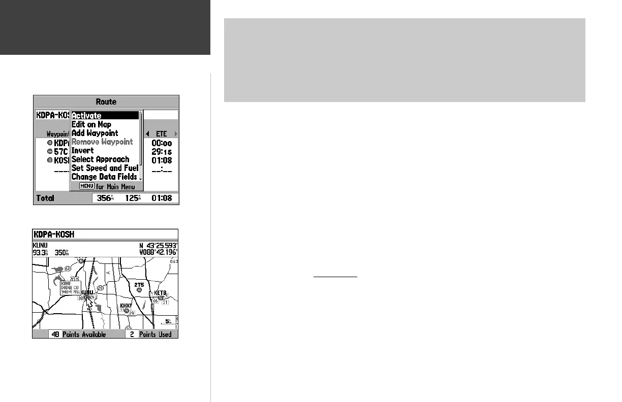 from the fi rst waypoint in the route, ‘Activate’ will place you on the fi rst leg and guide you along the entire