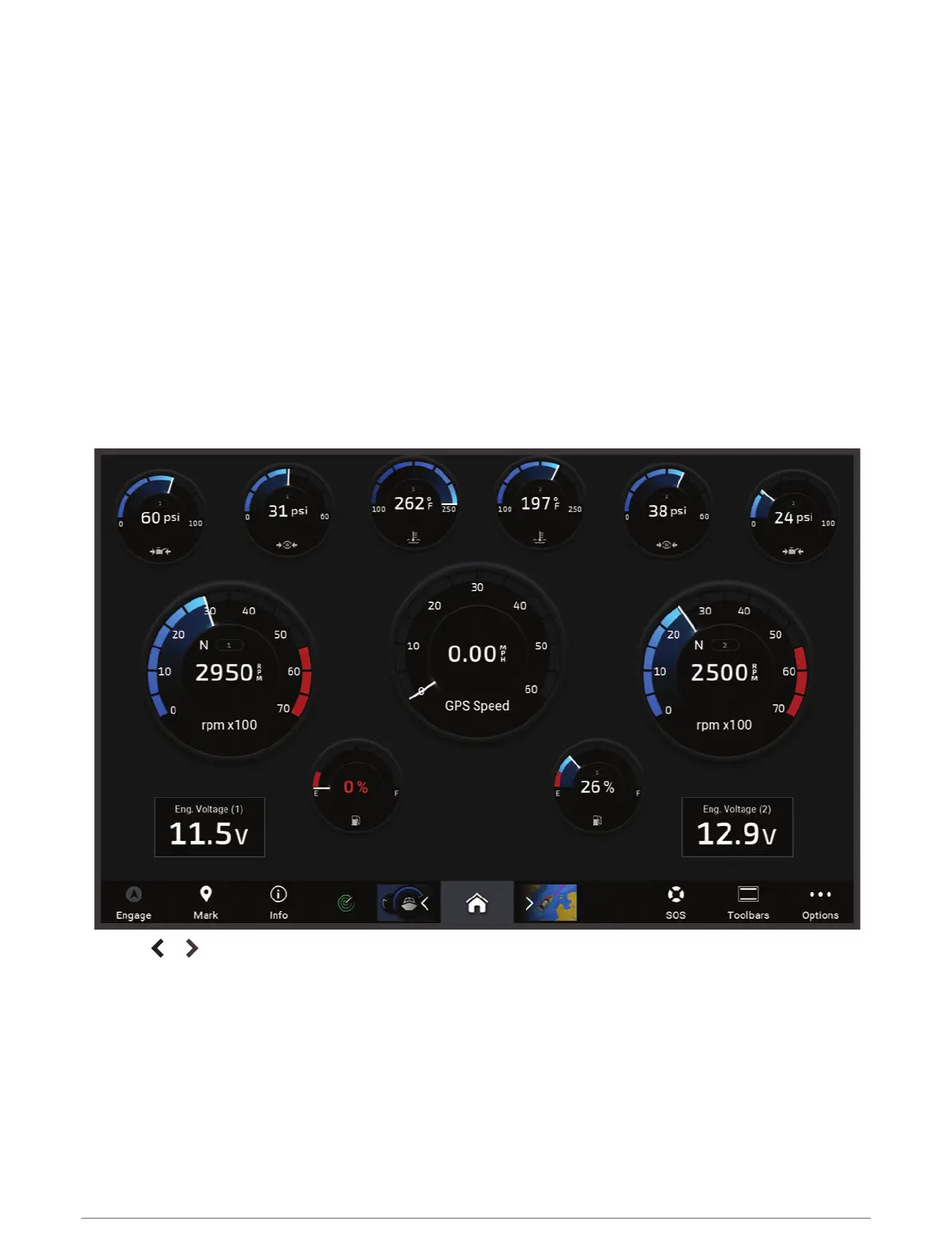 The gauges and graphs provide various information about the engine and environment. To view the information,