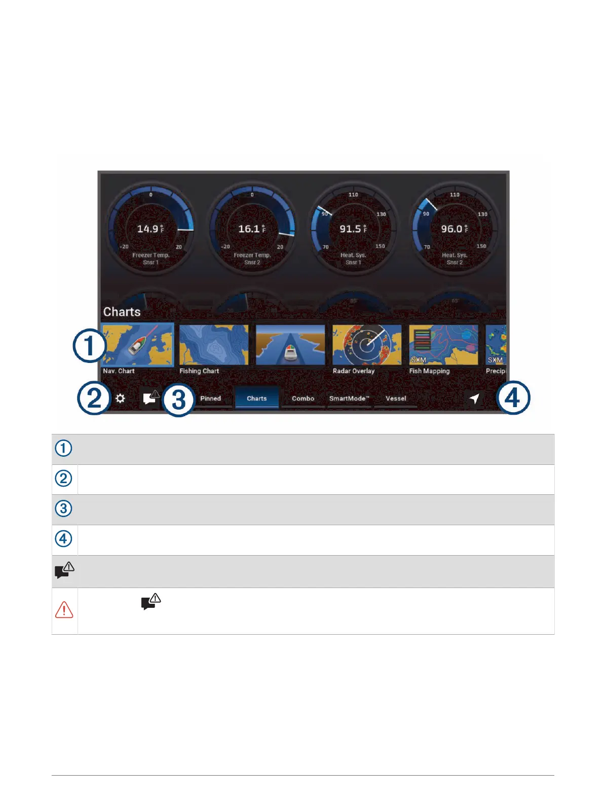 Opens a menu to view warnings and alerts and to access other communication such as AIS and DSC