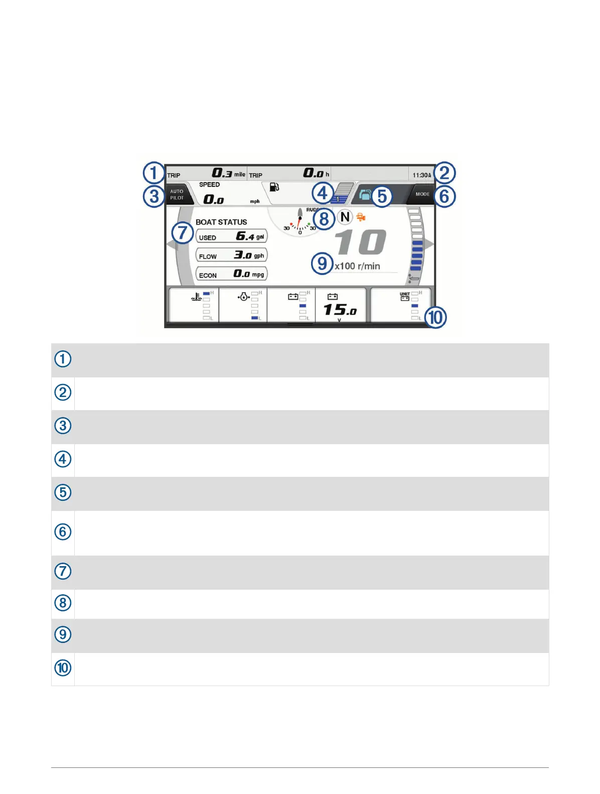 Select Vessel > YAMAHA to view the Yamaha engine gauges. This screen varies based on the engine network