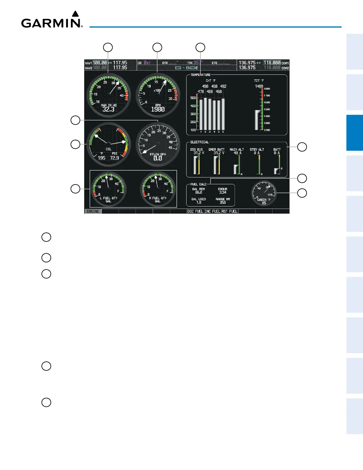 Fuel Calculation Group Displays calculated fuel remaining (GAL REM), fuel used (GAL USED), time remaining