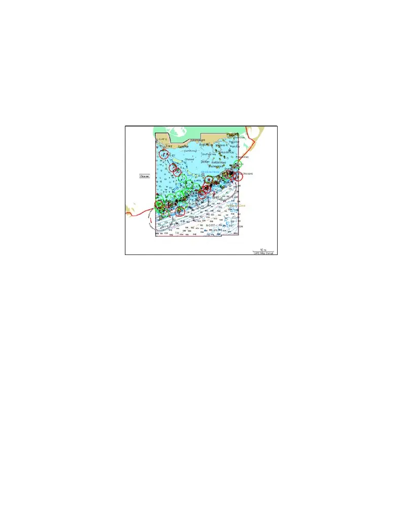 Notice the red, green, and white circles on the MapSource BlueChart map. These are