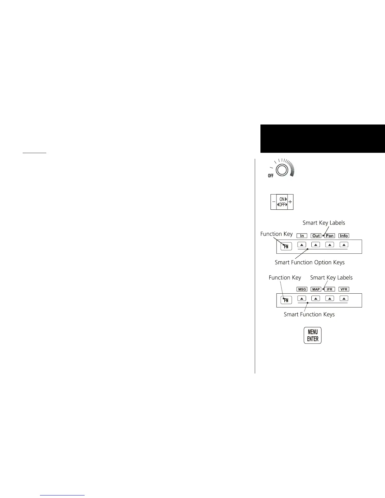 Use the FN key to display a list of the main functions, such as Map, IFR, Terrain, etc. Each time you press