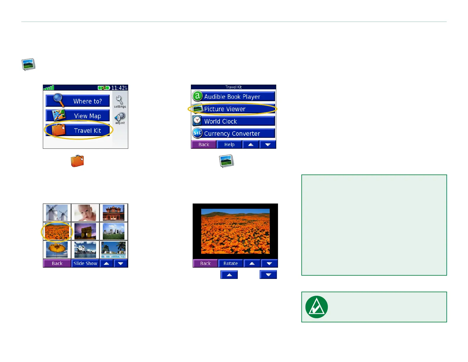 You can view pictures that you have stored in your Honda Portable Navigation System using the