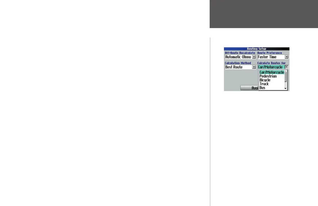 • Automatic (Silent): The unit automatically recalculates the route, but it does not announce to theAutomatic (Silent): The unit automatically recalculates the route, but it does not announce to the