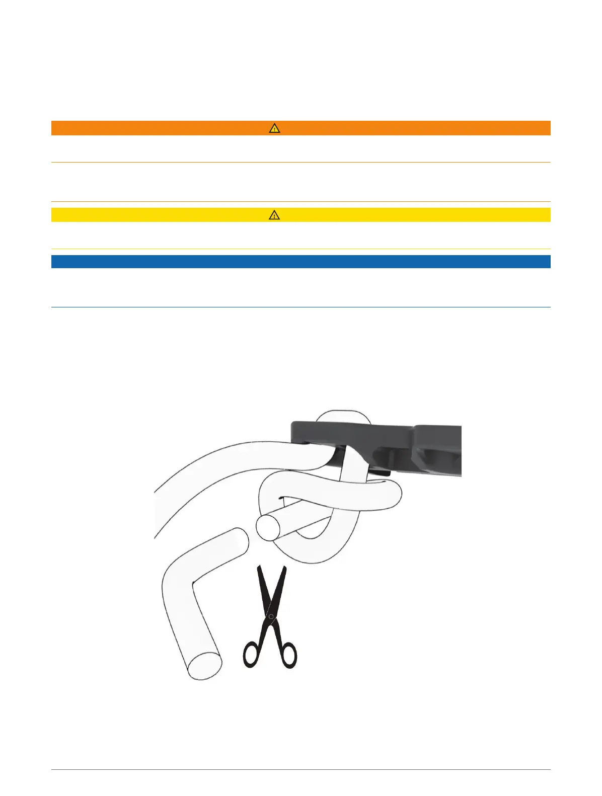 Brugeren må aldrig skære i elastiksnoren, mens den er på brugerens håndled, da dette kan medføre materiel