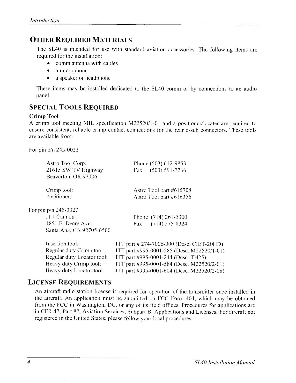 Garmin SL40 - Other Required Materials; Special Tools Required; License Requirements