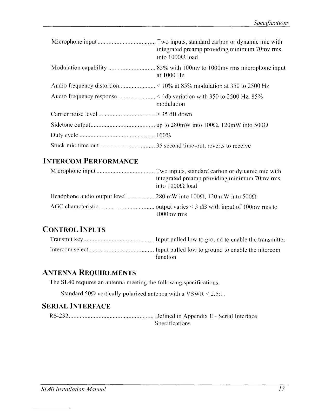 Garmin SL40 - Microphone Input; Modulation Capability; Intercom Performance; Control Inputs