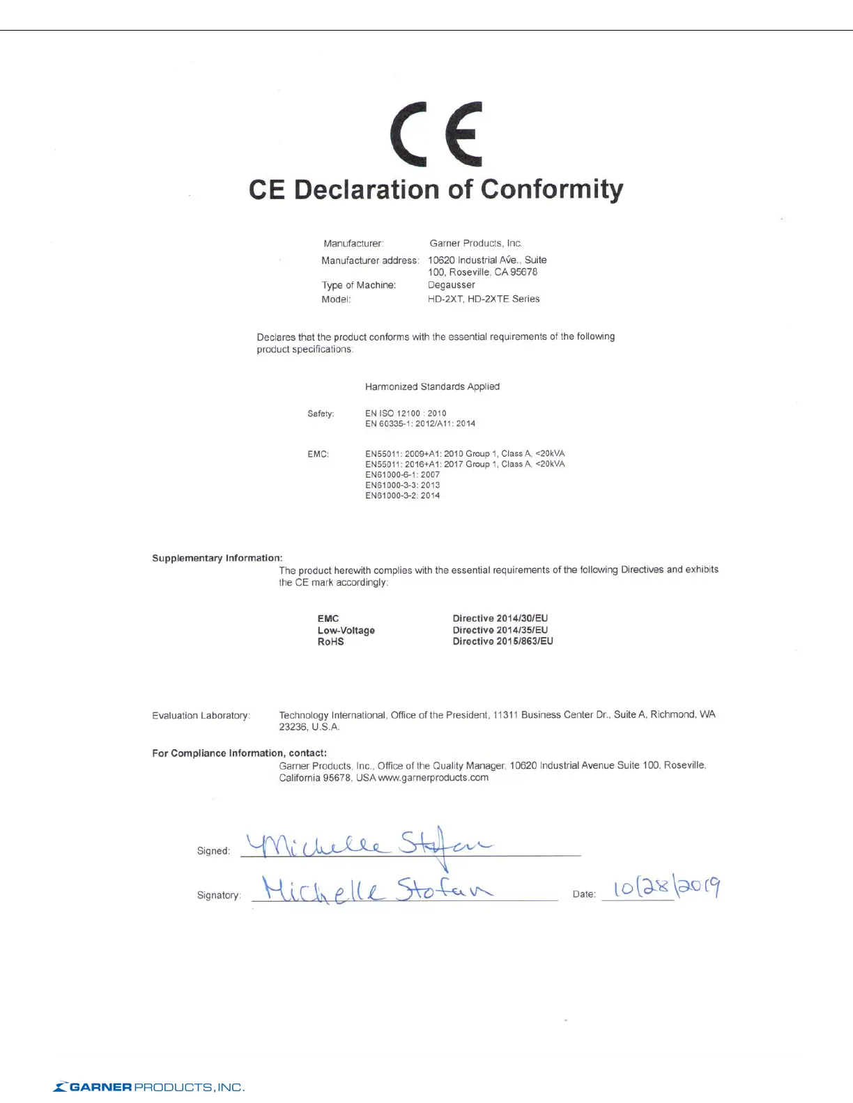 Garner HD-2XT Series - CE Declaration of Conformity; Supplementary Information