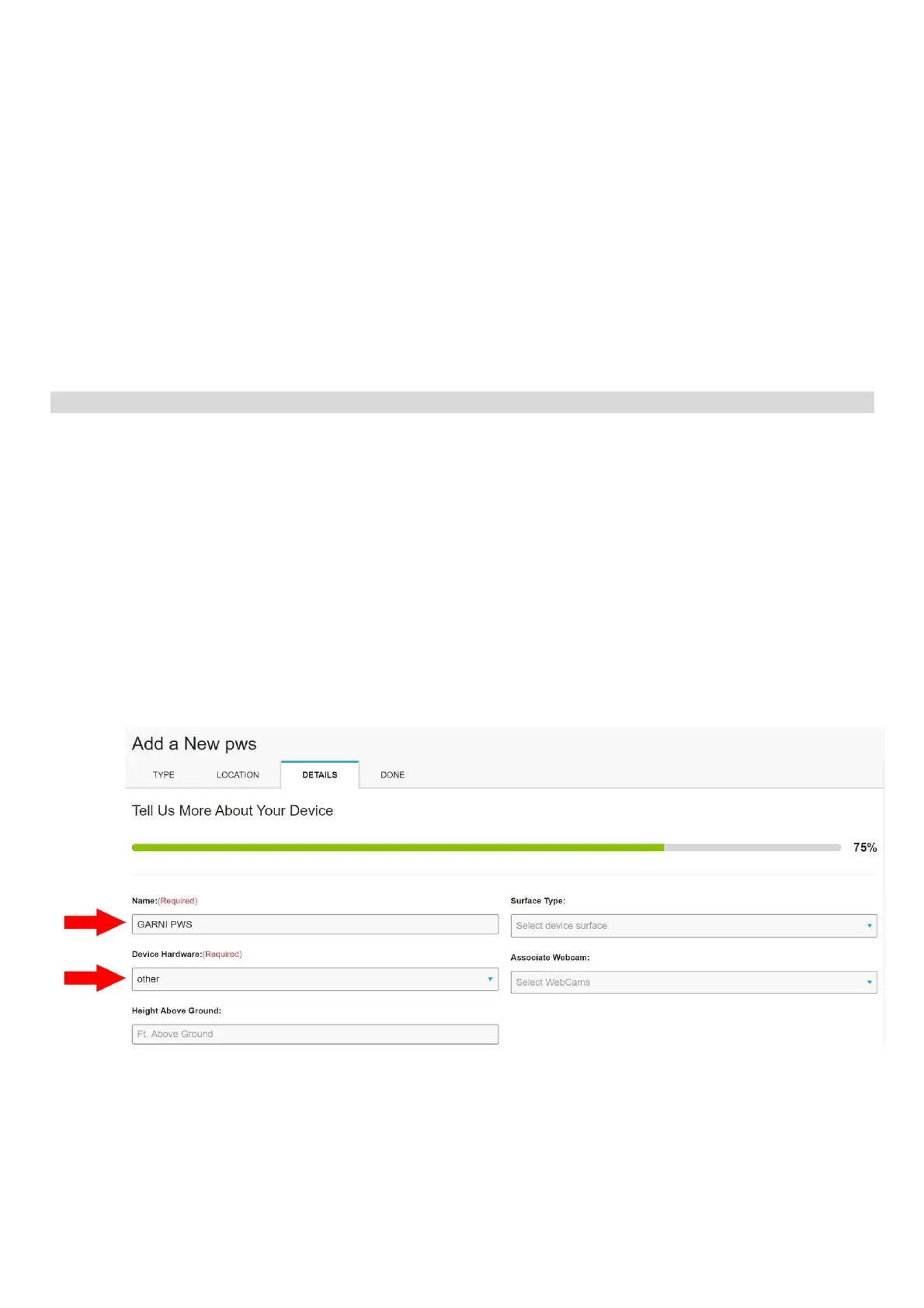 4) Choose the name of your weather station (Name) and select “other” in the “Device Hardware”