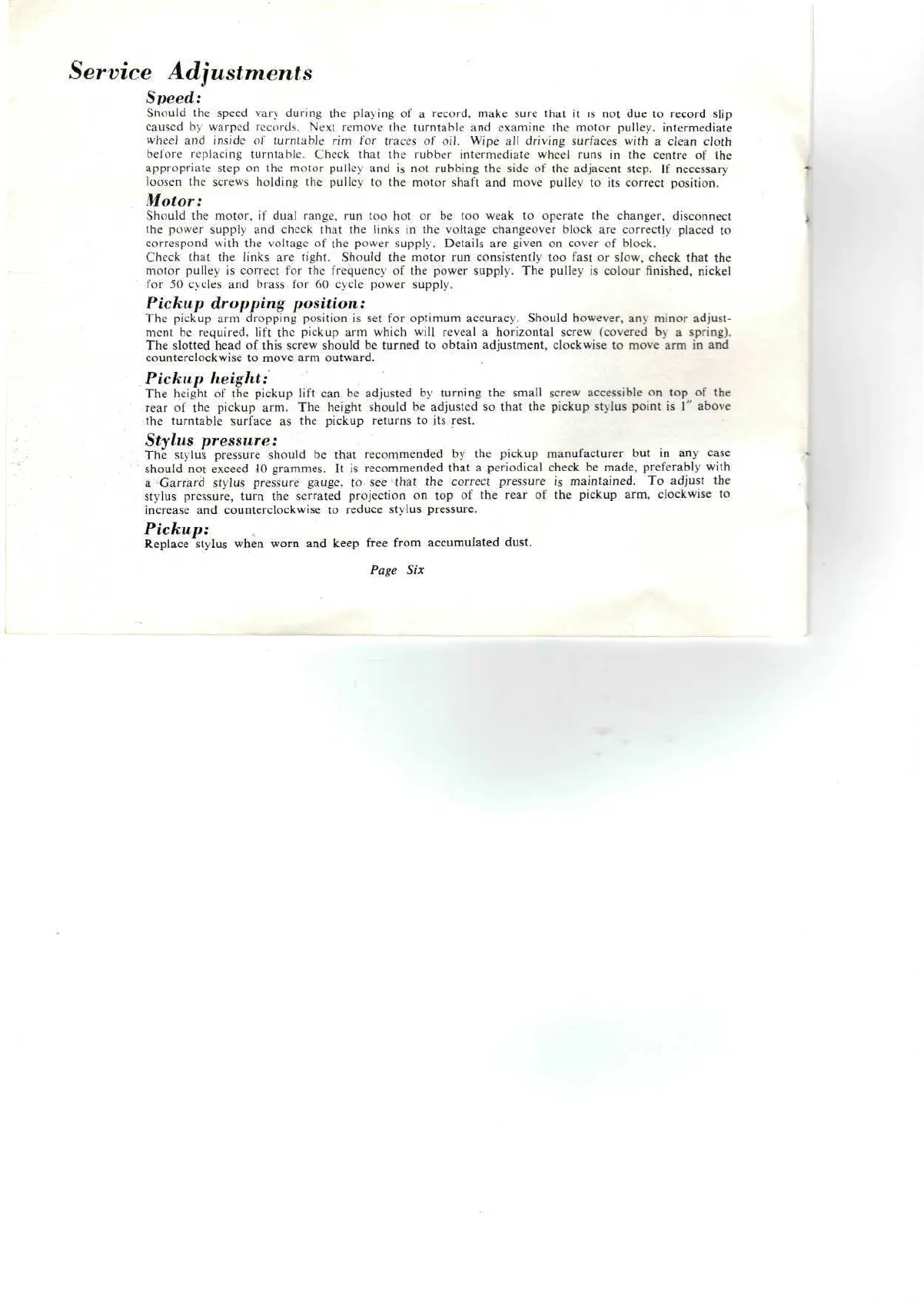 Garrard 210 - Service and Adjustments; Speed Adjustment; Motor Performance Checks; Pickup Dropping Position