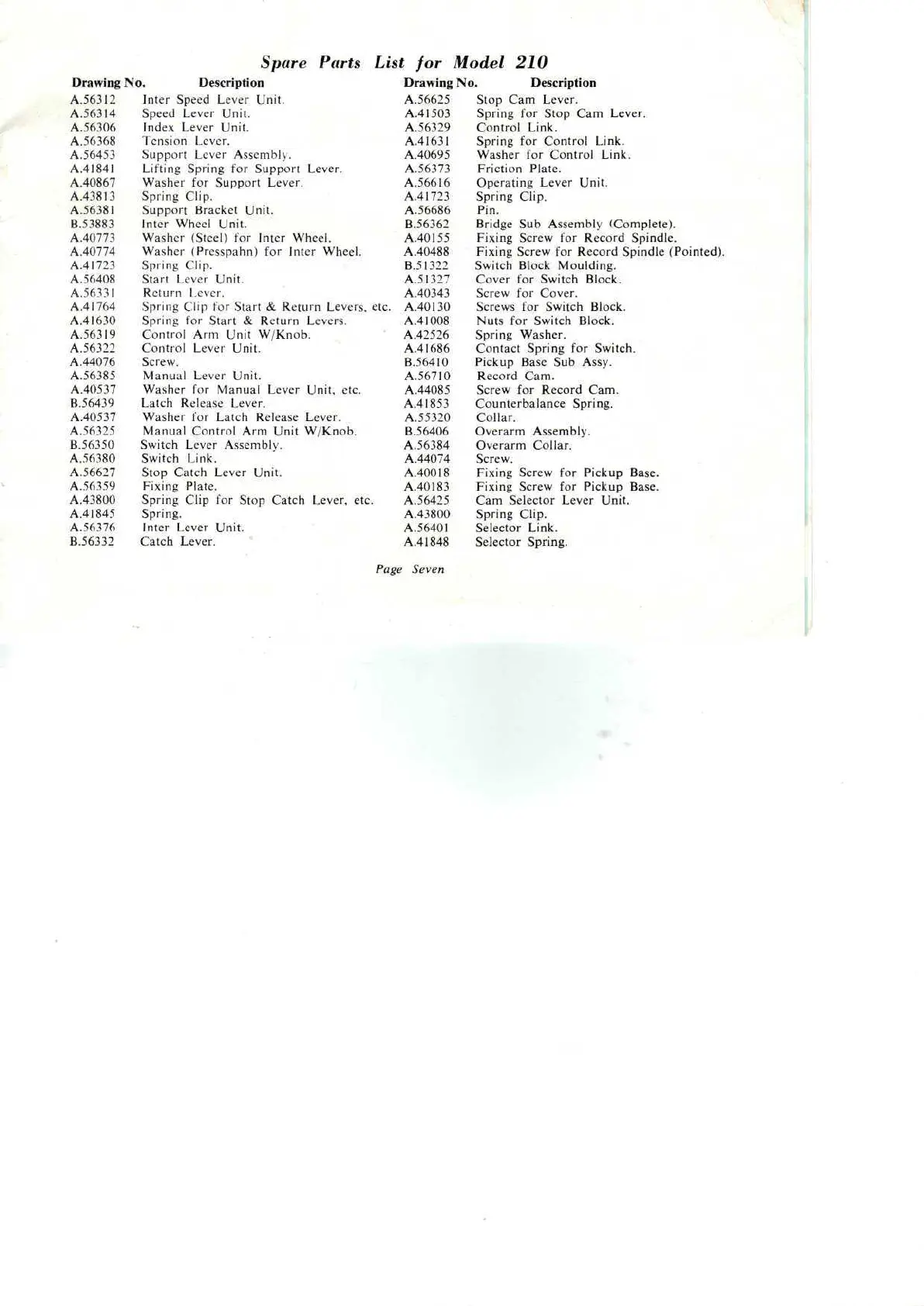 Garrard 210 - Spare Parts List