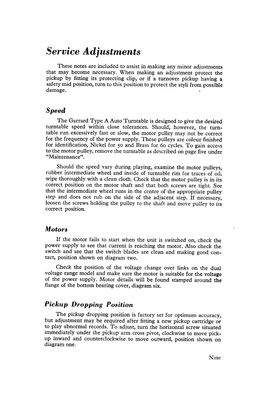Garrard A - Service Adjustments; Speed Adjustment; Motor Checks; Pickup Dropping Position Adjustment