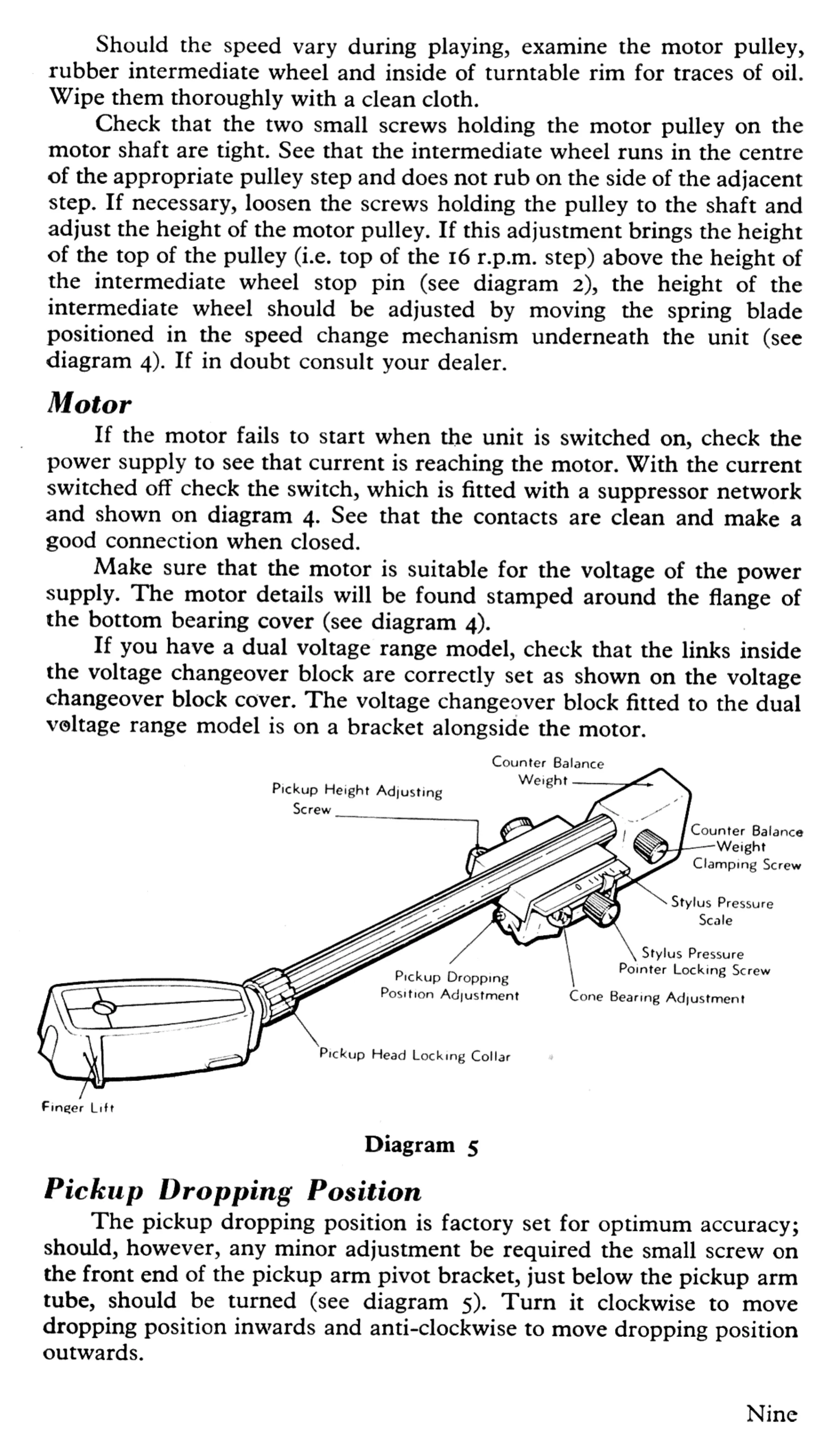 Garrard AT6 - Motor and Pickup Adjustments; Motor Speed Adjustment; Motor Troubleshooting; Pickup Dropping Position