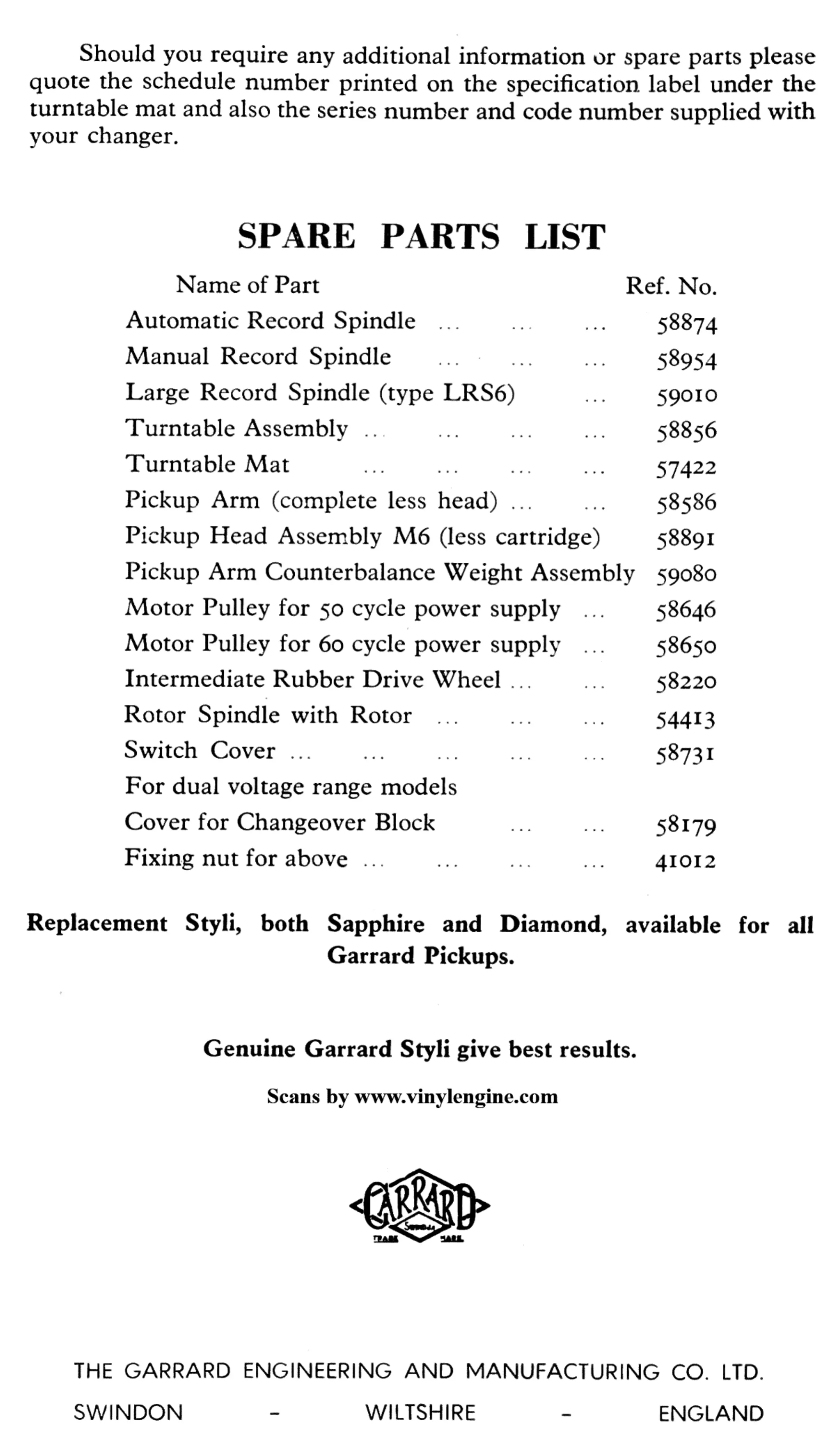 Garrard AT6 - Spare Parts List