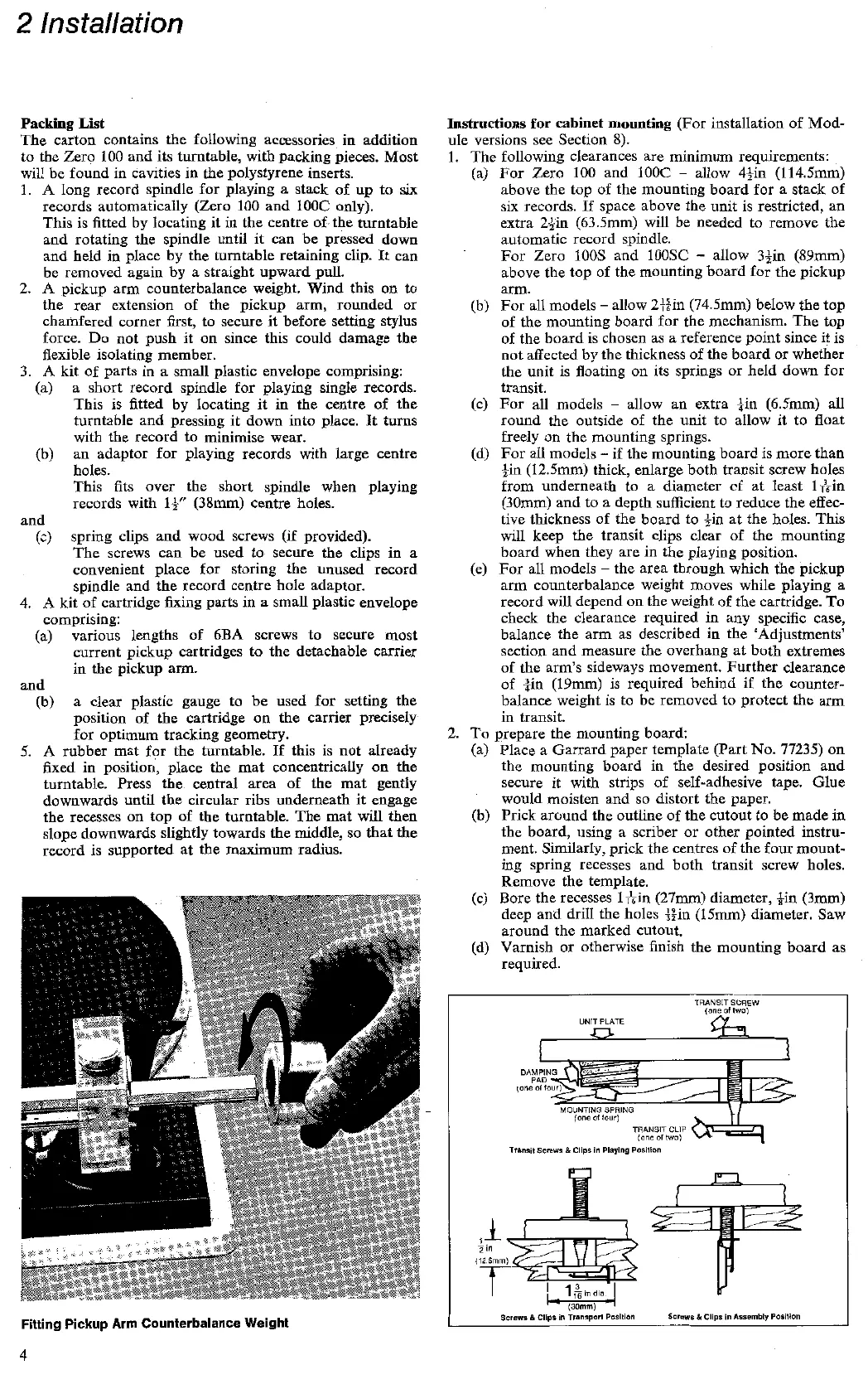 Garrard ZERO 100C - Installation; Packing List; Instructions for Cabinet Mounting; Fitting Pickup Arm Counterbalance Weight