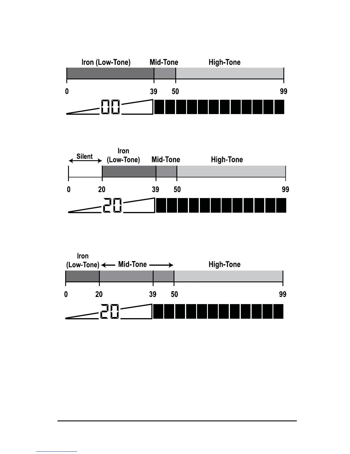IRON AUDIO OFF: Normal division of low, mid and high tones.