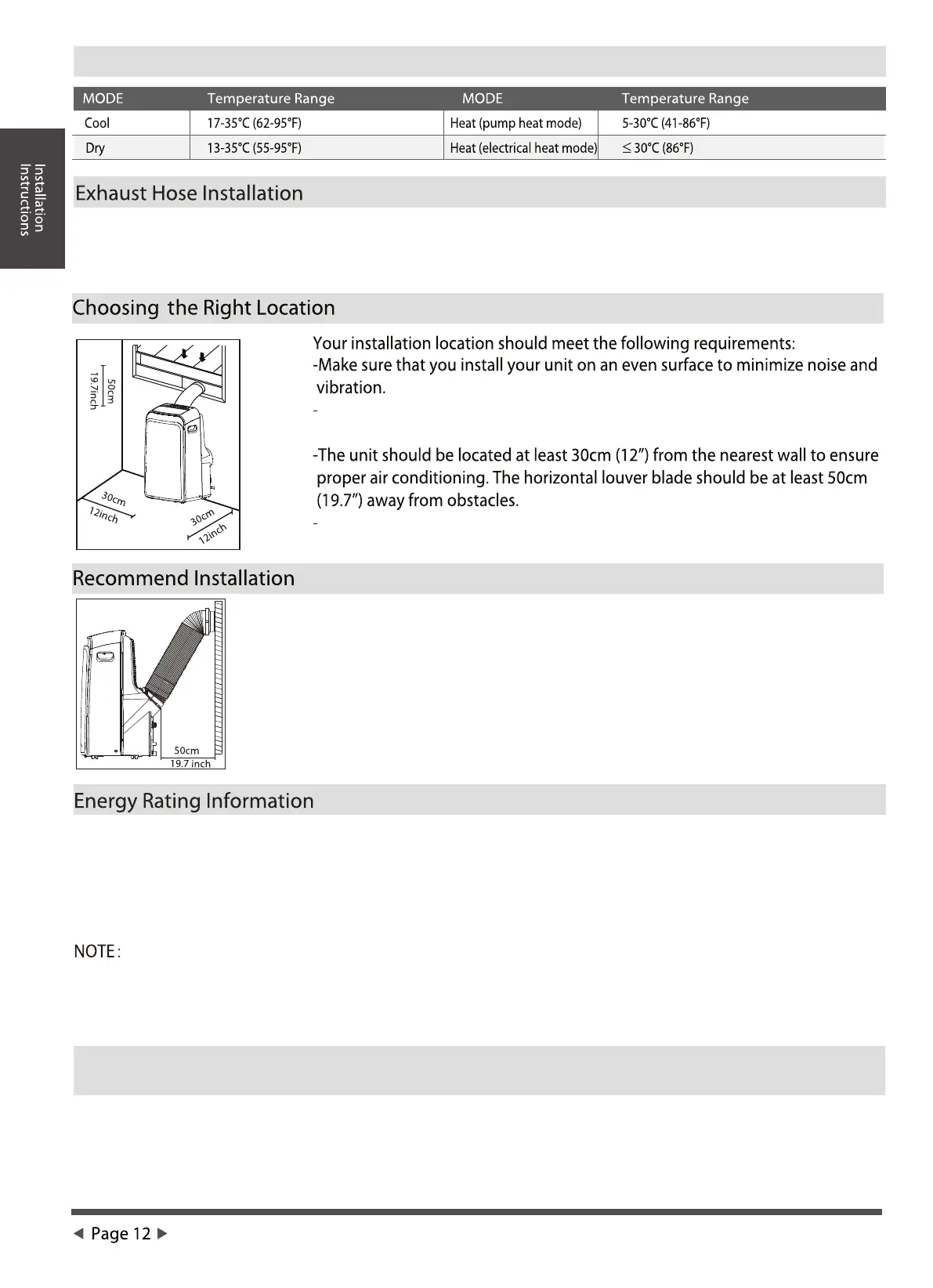 COOL, HEAT(heat pump type) or AUTO mode, the exhaust hose must be installed. For FAN, DRY or HEAT