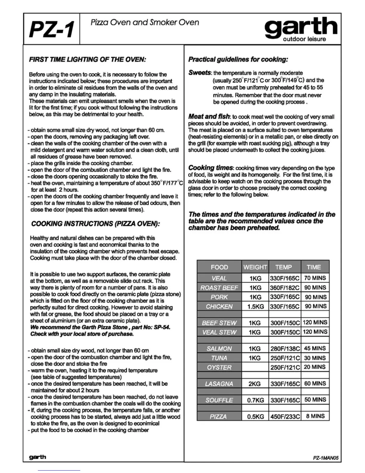 Garth PZ-1 - FIRST TIME LIGHTING OF THE OVEN; Initial Oven Preparation; COOKING INSTRUCTIONS (PIZZA OVEN); Pizza Oven Operation