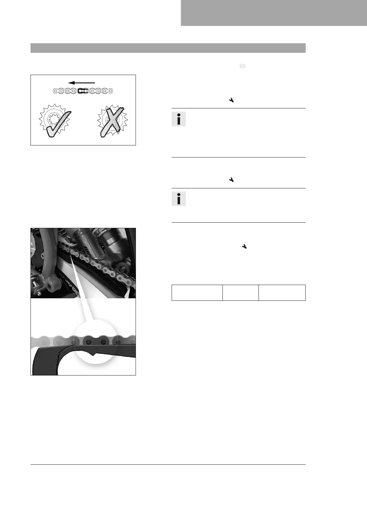 – Check the chain, rear sprocket, and motor sprocket for wear.