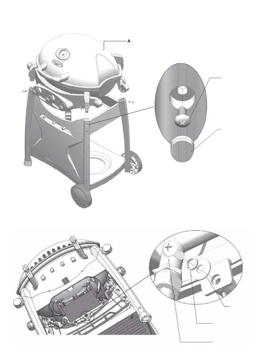 Locate the barbecue body as shown and secure with the four fasteners. Plug the holes as shown.