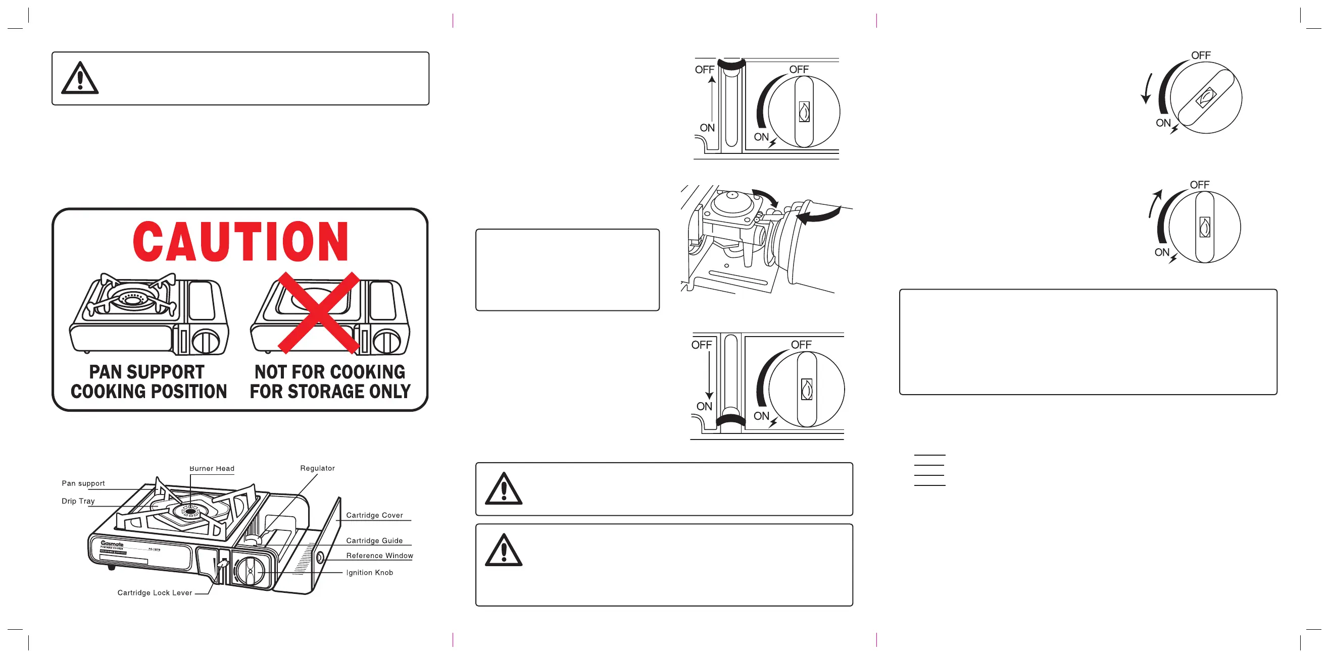 • Turn the Ignition Knob to ‘ON’ to release any excess gas inside the regulator. Repeat the 3 steps for