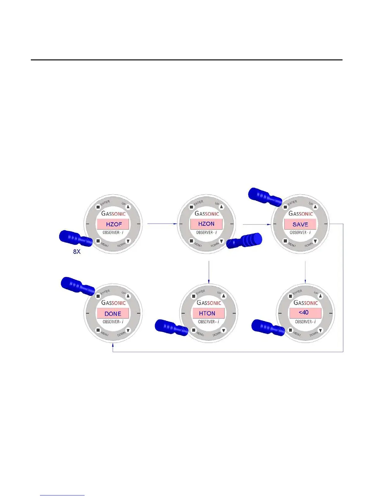 Activate the MENU switch eight times with magnet stick. The factory default setting (HZOF) will be