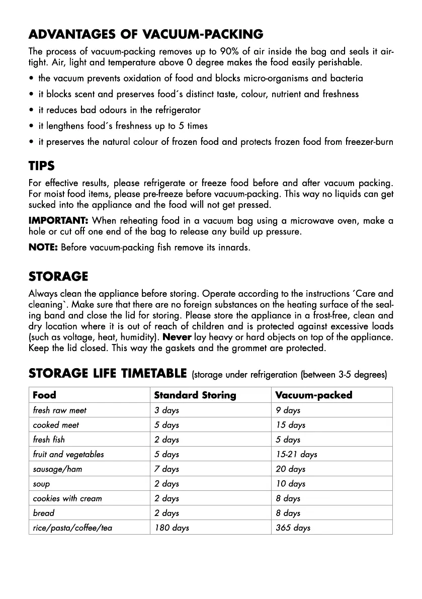 • the vacuum prevents oxidation of food and blocks micro-organisms and bacteria